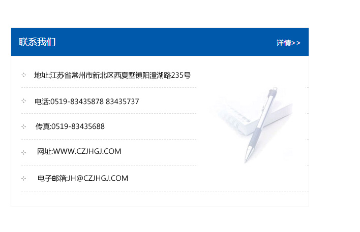 地址:常州市新北區友邦商務大廈1幢16、17層  電話:0519-85101652  傳真:0519-85112595  郵編:213022  網址:www.cz-jiayue_cn.hgfuwu.com  郵箱:xiajifengaa@163.com